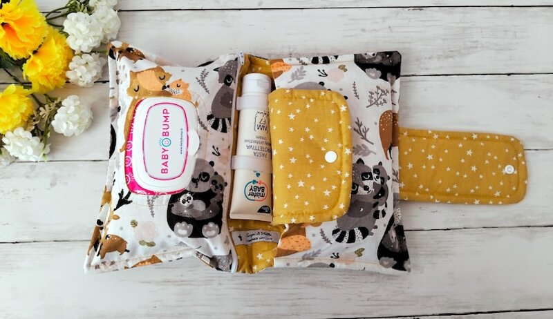⭐Porta pannolini con tasca per pannolini, salviette umidificate con comodo foro per estrarle ed elastici per tubetto di crema da 100 ml.