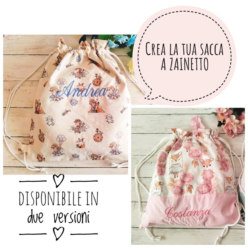 ⭐CREA LA TUA SACCA A ZAINETTO disponibile tutta in fantasia oppure con fascia in basso coordinata alla fodera e gancetto.
